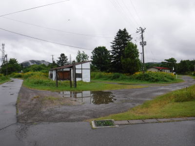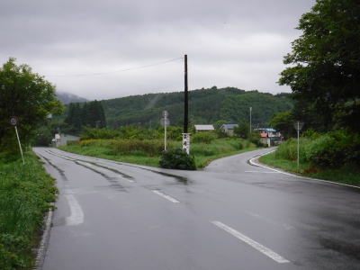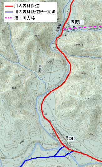 | 畑集落の中心部です。左折すると野平方向へ進みますが、川内森林鉄道本線はこのまま直進します。 かつては野平支線との分岐点に信号所があり、運行する機関車の調整のため電話連絡を行っていたとのことです。 |
