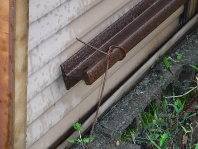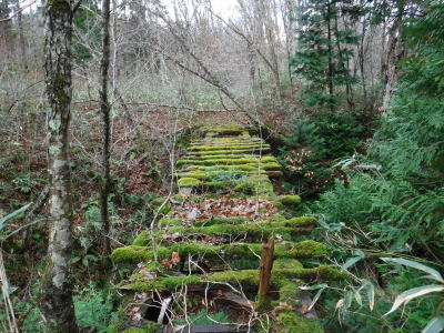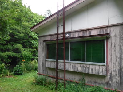 | 少し進むと、かつての営林署の造林宿舎の前を通ります。宿舎のはしごには軌条が利用されていました。 なお、この宿舎には、「飢餓海峡」に出演された女優の左幸子さんが宿泊していたとのことです。 |