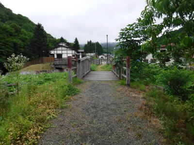 | 湯野小川を渡ります。いい雰囲気の橋ですが、森林鉄道廃止後に掛け替えられたものと思います。左に見えている白い建物は日帰り温泉の濃々園(じょうじょうえん)です。 川内森林鉄道は、湯野川温泉の湯治客の足としても活用されており、森林鉄道開通後は日帰りの客が増加したとのことです。 |