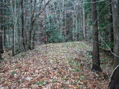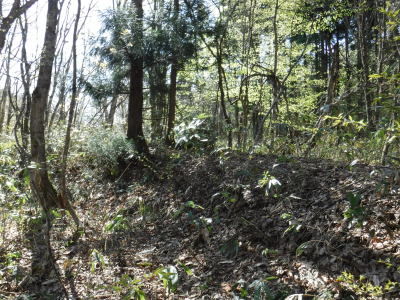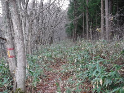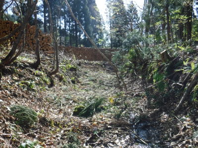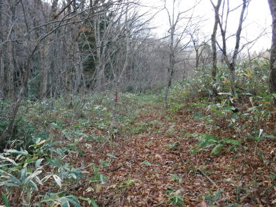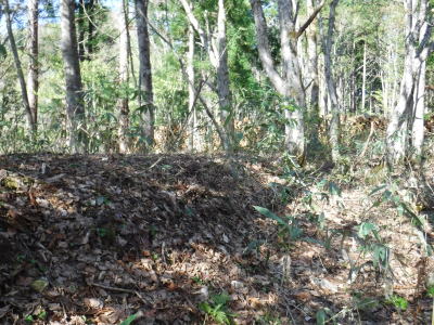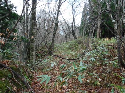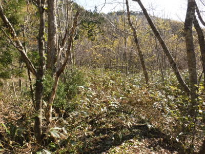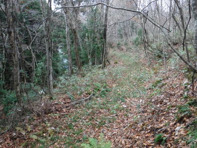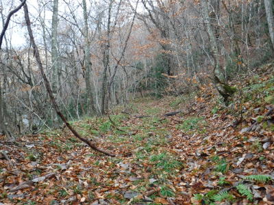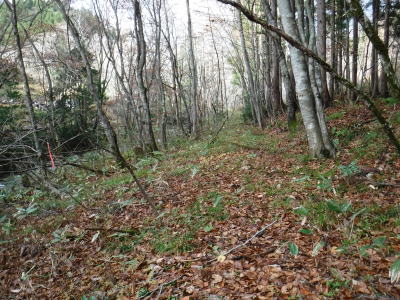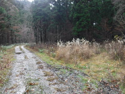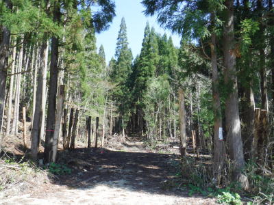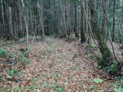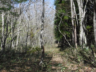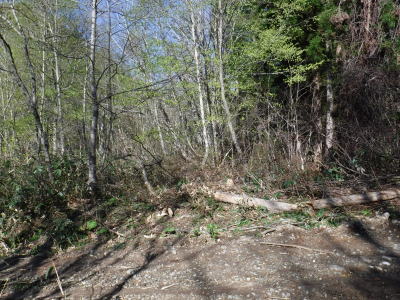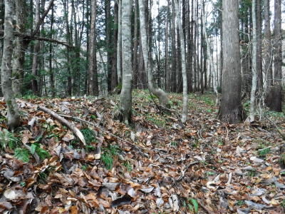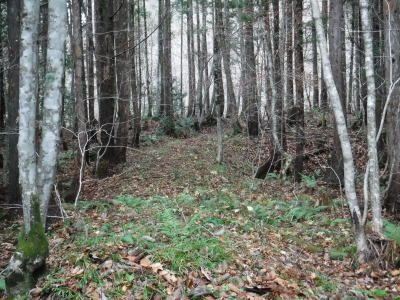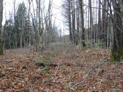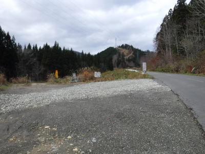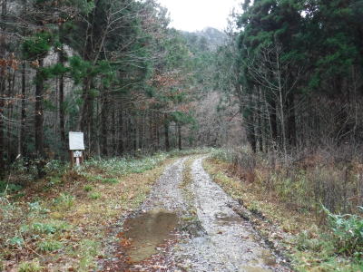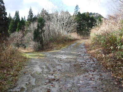 県道との分岐点です。ここからは県道から離れて林道を進みます。 この辺りは広くなっているので、土場があったのかもしれません。 |