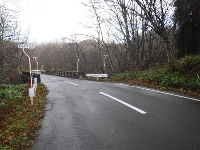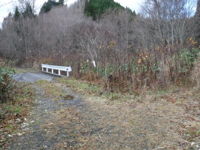 | 先に行く前にちょっと寄り道です。 大畑川沿いで伐採されたヒバについて、青森までの輸送期間を短縮するため、大畑森林鉄道ではなく、山を越えて川内森林鉄道で運材するという下北半嶋森林鉄道が計画されていました。そのルートは大畑側の重兵衛沢から、川内側の下重兵衛沢へ隧道で抜け、川内森林鉄道につなぐというものですが、実現はしませんでした。 写真のガードレールを越えた先を右へ曲がると、下重兵衛沢です。林道が続いているようでしたが、未成線なので調査は行いませんでした。その代わりに、計画の経緯などを過去の東奥日報で調べてみましたので、一番最後に紹介したいと思います。 |