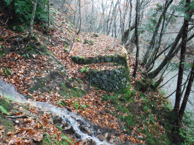 今度はさらに大きめの沢を渡ります。石垣の橋台のほか、橋脚も残されていました。 |