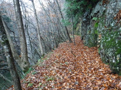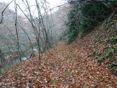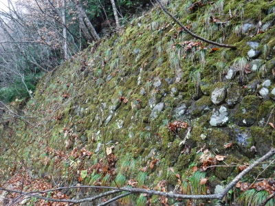| 土砂が崩れて斜面になっている箇所がありますが、頑張って進みます。 | 通ってきた箇所を振り返ると、路盤が石垣で補強されていました。 |
