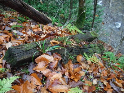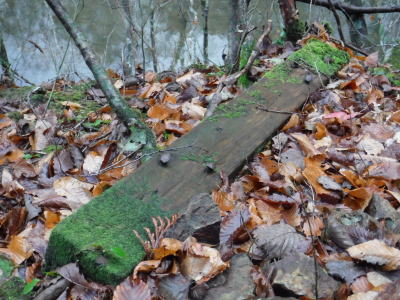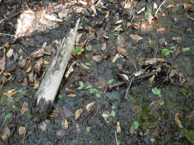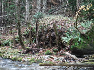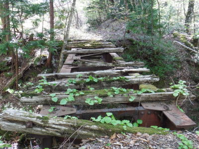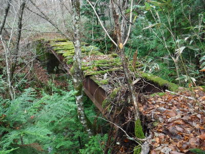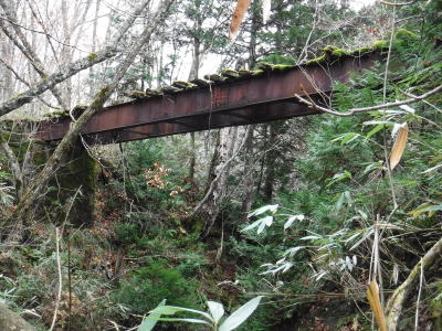 | ようやく終点付近のカモリ沢を渡る橋に到着です。軌条を利用した柱が残されていました。 軌道跡はまだ左方向へ続いていたと思われますが、少し進んでも何もなさそうなのでこの辺りで引き返しました。森林鉄道の終点としては、何かあっけない感じがしました。 |