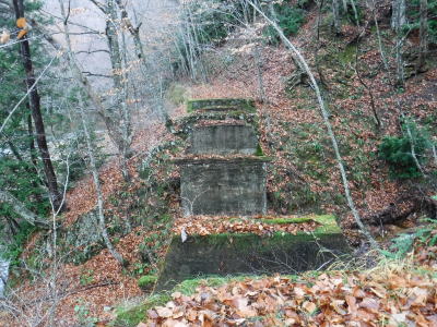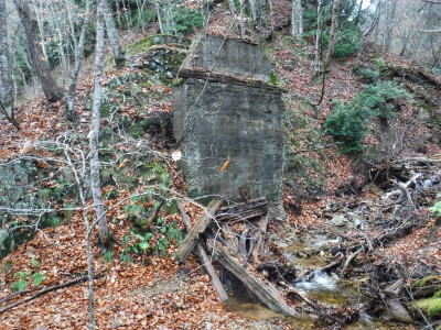 | 安部城沢を渡る箇所に石垣の橋台が残されていました。なお、この沢を少し進むと、安部城鉱山跡があり、レンガの煙突などが残されているようです。 安部城鉱山は明治42年から本格的に創業を開始しましたが、大正12年に精錬事業が中止となり、短い期間ですが町は繁栄しました。一方で精錬所から多量の亜硫酸ガスをを含んだ煙が排出されたため、地域の樹木や農作物は被害を受け、枯死しました。被害木の整理伐採は10年を要することになり、川内森林鉄道は、この被害木の運搬にも活躍しました。 |
