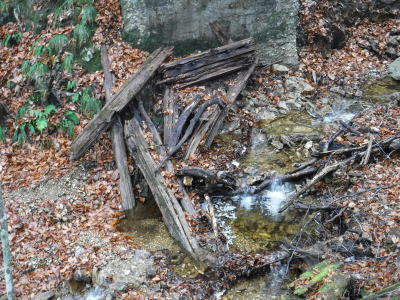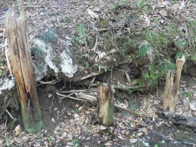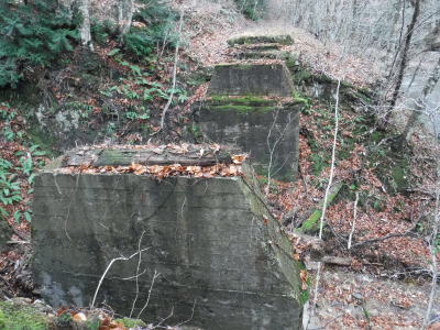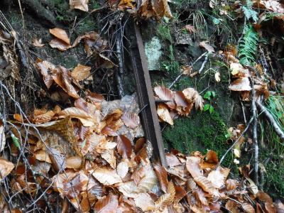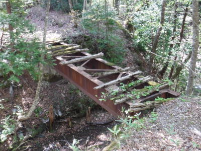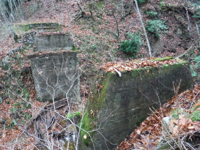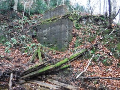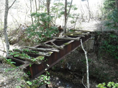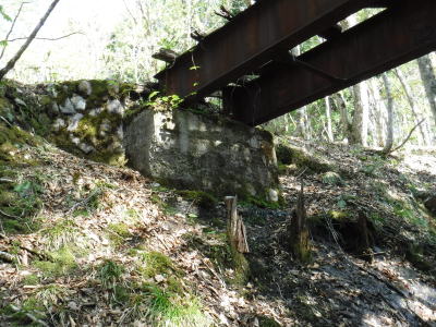 | 沢を渡る箇所に橋脚と、金具のついた橋桁の残骸がありました。よくぞ残っていてくれました。 | ||