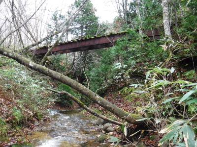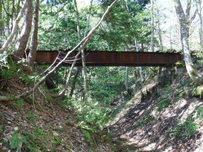 | しばらく進むと、またしても地理院地図に無い沢(下重兵衛沢)を渡る箇所に鉄橋がありました。苔むした枕木がいい感じです。 | ||