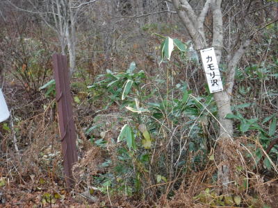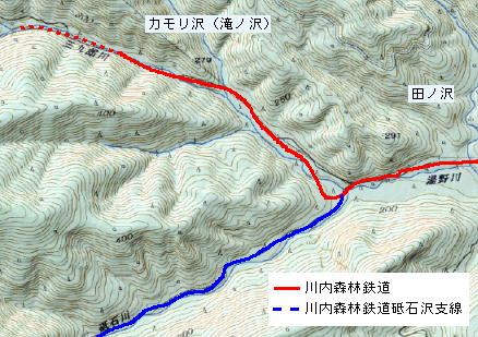 | 右に進むと終点のカモリ沢へ進む林道ですが、軌道跡はここを進まず、左へ進みます。 正確な軌道跡は、調査の帰りに気がつきました。 |