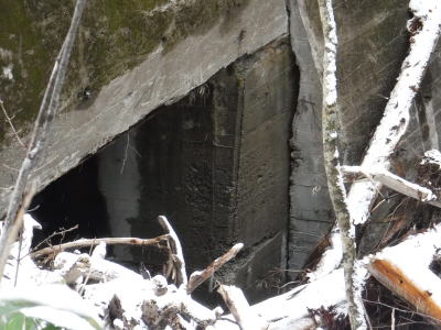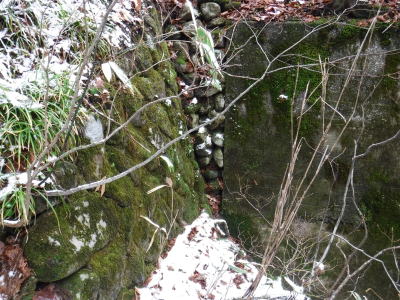 (季節は一瞬冬になりますが御了承ください。) 軌道跡は県道に合流し北上します。 和白沢を渡る箇所で下をのぞき込むと、怪しいコンクリと石垣を見つけましたが、遺構とは違うかな? |
