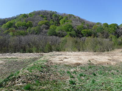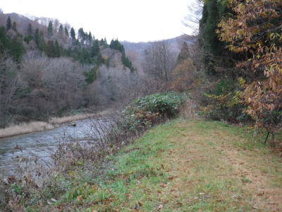 少し進むと開けた場所に出ました。 軌道跡はここで写真右方向にUターンし、S字で進んでいきます。川沿いはちょっと低い位置を進んでいたので、高度をとるため対応と思われます。 |