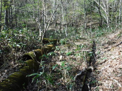 | 軌道跡は丸太沢林道に到達します。先に進めなさそうに見えますが、そのまま林道を突っ切ると土管などの人工的な構築物が見られました。 | ||