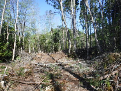 | 軌道跡の先に、先ほど突っ切った丸太沢林道沿いに、伐採された木材が積み上げられています。 もう一度、この林道を突き進みます。 |