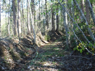 | 沢を渡ってから起点方向を撮影しました。一直線に続く軌道跡の先に、対岸の橋脚がちょっとだけ見えるかと思います。 また、横から撮影すると、道床が盛り上がっていることが確認できます。 |
