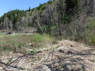 | しばらく県道を進むと、南側に耕作放棄地が表れます。この耕作放棄地の向こう側に軌道跡があるはずです。 | ![]() |