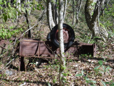| 沢には水を堰き止める石垣のようなものがあったほか、リヤカーらしきものがありました。地理院地図には、この付近は湯野川開拓との記載があるので、かつては人が入り、生活していたことがうかがえますが、ちょっと寂しい感じです。 | ||