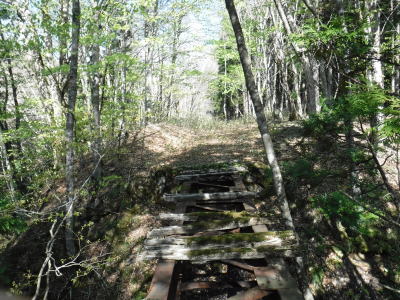 | 小さな沢を渡る箇所に、木橋が残されていました。 | 美しく一直線に延びる軌道跡、とても進みやすくなりました。 |
