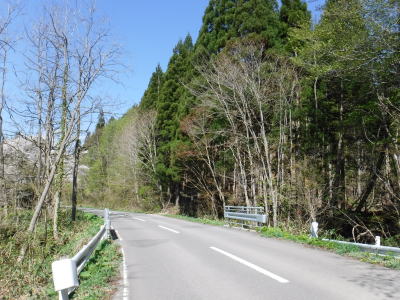 県道は湯野川沿いに北上した後、西へ進路を変えて進みます。 |