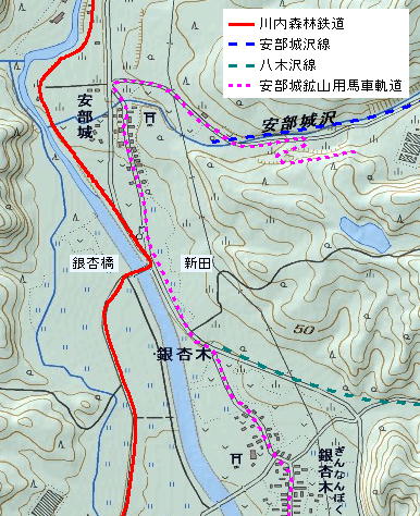| ここまで特に遺構を見つけられませんでした。軌道跡は銀杏橋で川内川の左岸へ渡ります。 | ![]() (この地図はカシミール3D「山旅倶楽部」を使用して作成しました。) |