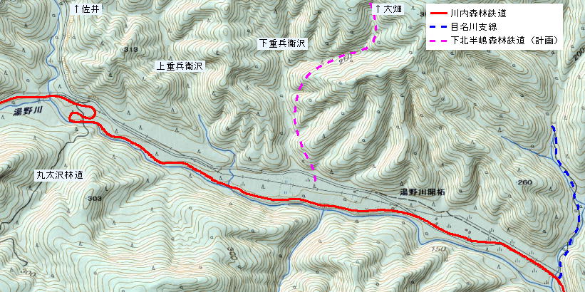 | 軌道跡はいよいよ湯野川上流の終点へ向かいます。 | (この地図はカシミール3D「山旅倶楽部」を使用して作成しました。) |
