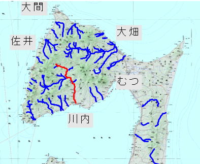 川内川河口、陸奥湾方向を撮影しました。 森林鉄道の起点はここから少し上流の川内貯木場です 森林鉄道で運ばれた木材を、ここから官船で搬出するため、貯木場から川沿いに搬出線が敷設されていましたが、その面影はありません |