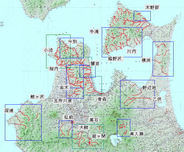 | 青森県内の森林鉄道・軌道分布図 ・赤色の細い線が森林鉄道・軌道跡です。 ・四角をクリックすると拡大図が開きます。 |